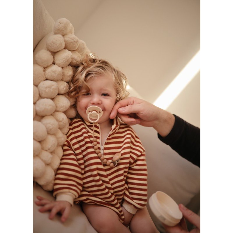 The FRIGG line of rope rubber pacifiers is thoughtfully designed for your baby's comfort and features an entwined rope that surrounds the pacifier shield. The outward curve keeps the pacifier off delicate skin, while air holes and a security handle ensure your baby stays safe. Available in a range of soft colors, FRIGG pacifiers make a beautiful addition to your collection of baby essentials.
