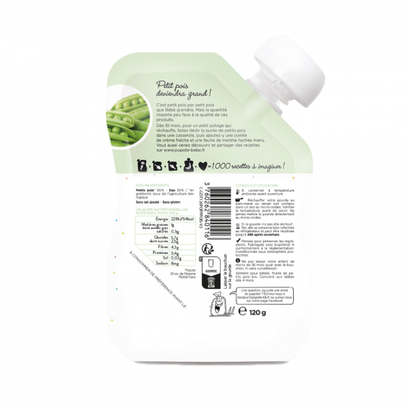Store at room temperature before opening. To reheat: place your bottle in a bain-marie or pour its contents into a bowl in the microwave. Check the temperature before serving. Never put the pouche directly in the microwave.