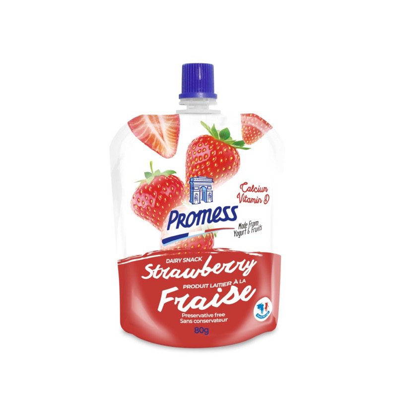 Promess Strawberry Yogurt Pouch is a dairy snack made with yogurt and fruits made up +80% milk. Made from 100% French fresh milk, source of calcium and vitamin, with only 80kcal per pouch and without preservatives or artificial flavours and colouring. Perfect healthy & tasty snacks for children and adults at school or at the office. Thanks to convenient pouch format, you can bring it everywhere and have it any time!
