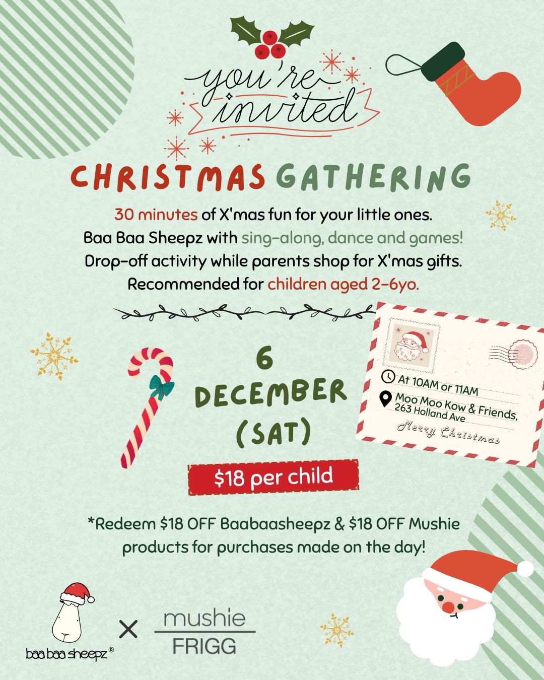 Join us for 30 mins of Christmas fun with BaaBaaSheepz and Mushie. Drop-off activity for kids aged 2 to 6yo (recommended) includes sing-along, dance and mini games. Parents can shop at Flagship store* for Christmas gifts while the kids are engaged in the activity. Tickets priced at $18 for each child and it's FULLY REDEEMABLE with $18 BaaBaaSheepz store credits and $18 Mushie store credits for purchases made on the same day. Yea, your eyes are not playing tricks on you - that's a TOTAL of $36 value! Fastest fingers first so hurry and get your tickets now!